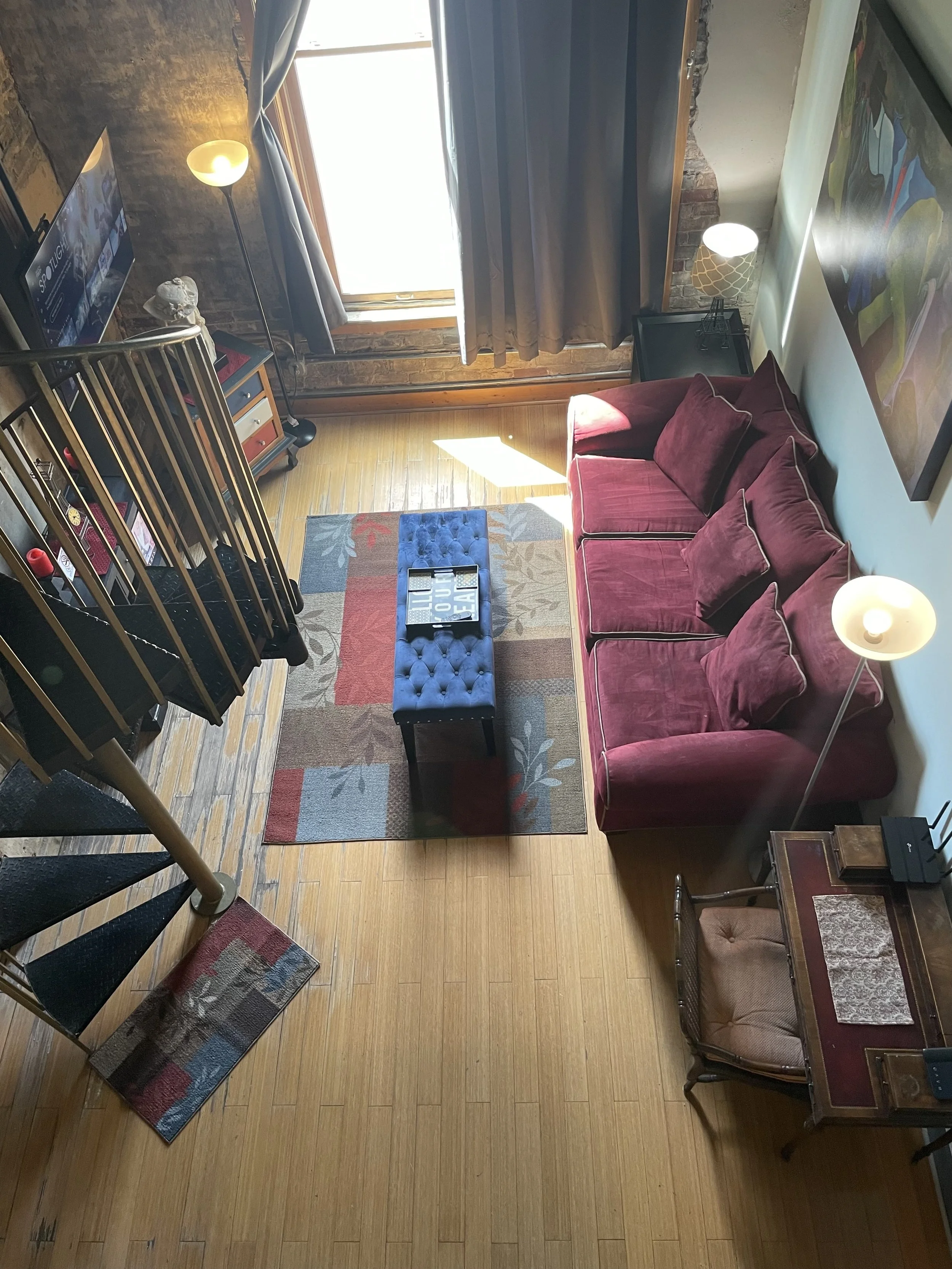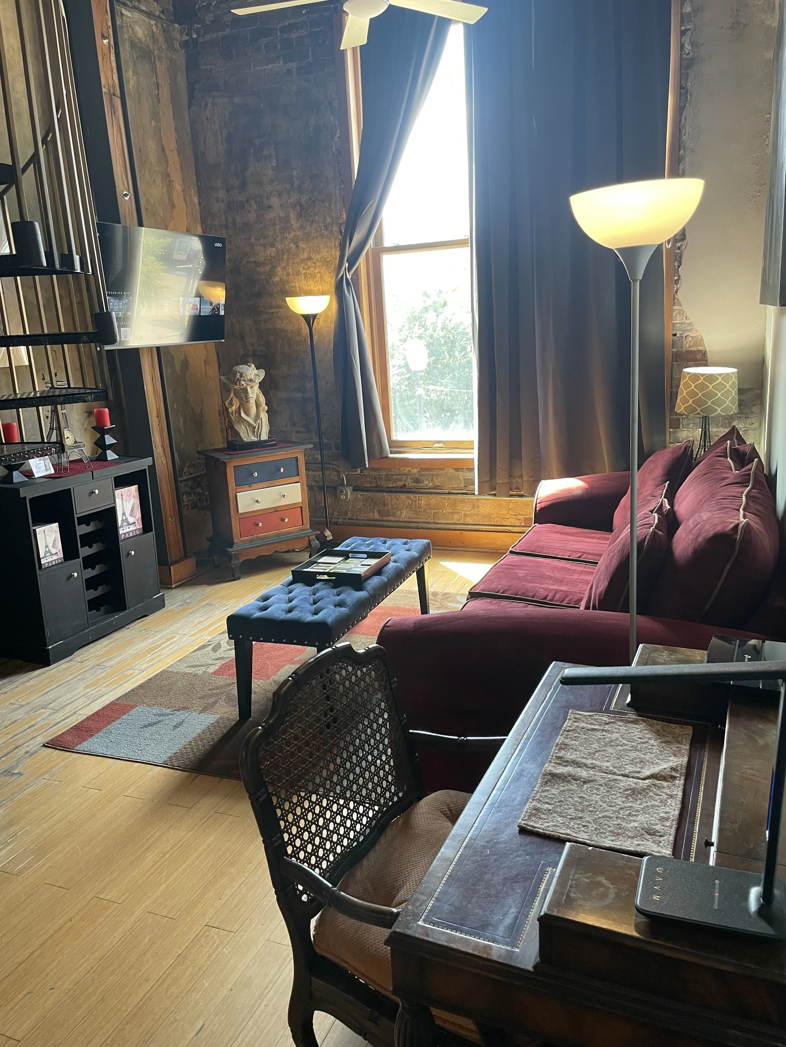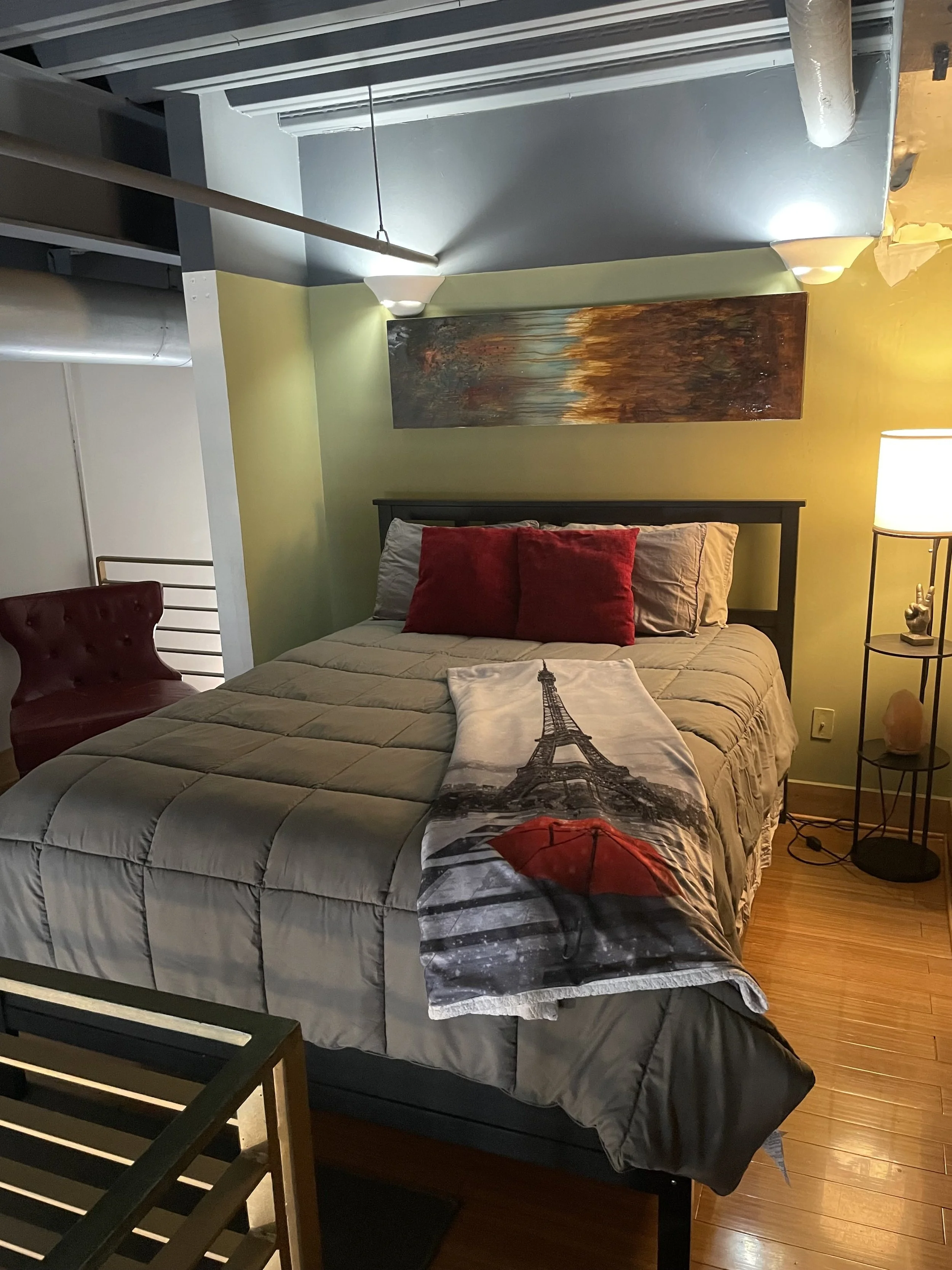 With unique Paris decor, this loft will make you feel like you are in one of France's finest homes. The spacious living room overlooks Market Square, the center of it all! Behind stylish barn doors, there is a 1st floor futon bedroom that sleeps two. In the loft, there is a queen bed and cozy sitting area. From corkscrew to Keurig, the kitchen is fully stocked, just like home. With private rooftop access, come enjoy your Downtown Knoxville experience in this fabulously French loft!